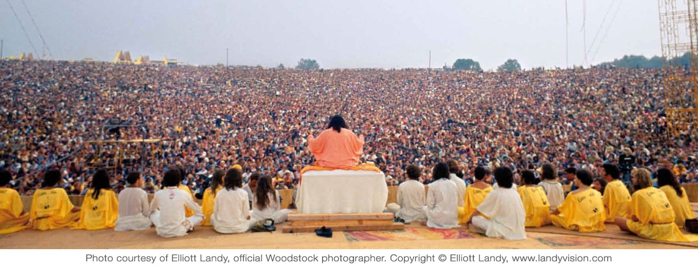 于是,在伍德斯托克音乐节的开幕式,萨其达南达乘坐直升机空降舞台。他在舞台上盘腿安坐,告诉人们,美国已经在物质领域帮助了世界,现在是时候在灵性领域帮助世界了。“人们喊道‘为和平而战’,但我不明白,他们要如何在战斗之后找到和平。所以,让我们别去为和平而战,先在内心找到和平吧。“最后,他带领几十万美国年轻人唱诵梵文祷词,歌颂守护之神毗湿奴。