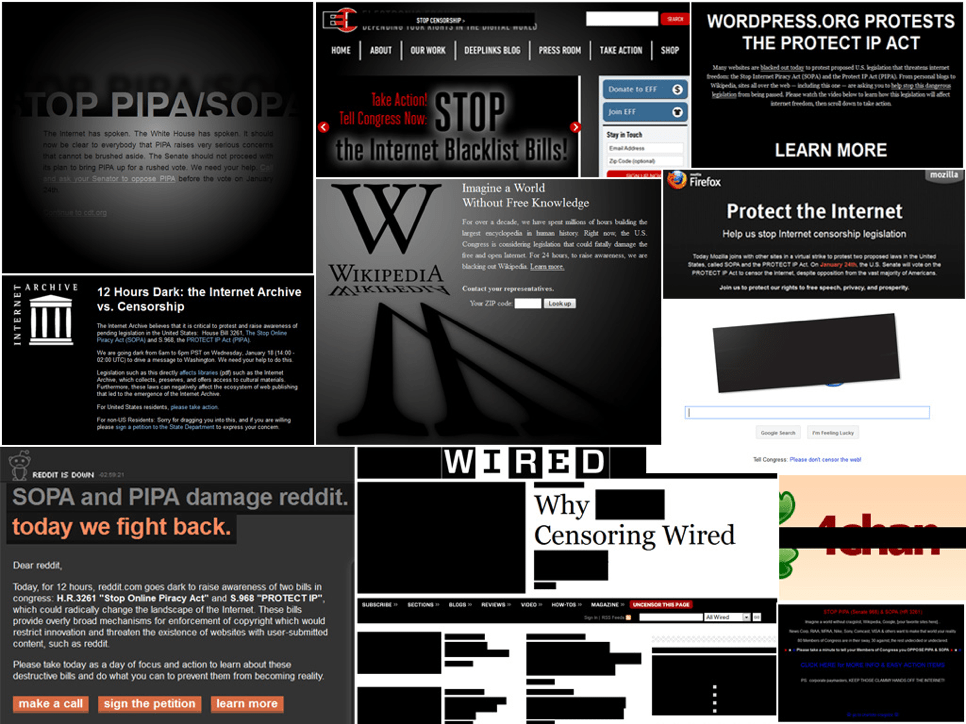 法案听证的当天,各大网站黑屏抗议,号召大家抵制这个法案通过。