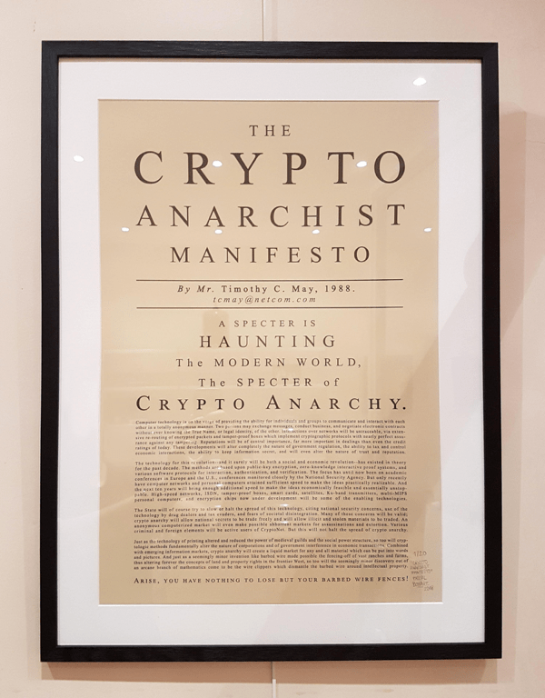 88年Timothy May离开英特尔后,仿照《共产党宣言》开头,写了个Crypto Anarchist Manifesto,里面总结了时人对理想数字空间的想象:一个自由交换和交易信息的市场,不受第三方的监听和审查。