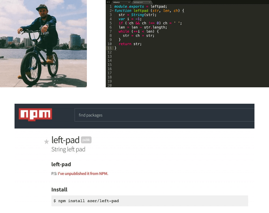 其中有一个叫left-pad,很简单的几行,给任意字符串左边加上重复字符。这个包删除之后,影响在全世界范围内波及开了。澳大利亚、德国、捷克、美国等各地的程序员开始发现自己的项目出现了奇怪的错误,包括这个故事里的大公司自己的网站。