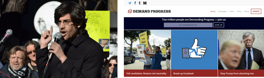 知道SOPA法案后,Swartz马上做了一个用来号召政治运动的网站,叫Demand Progress,影响范围很大,号召了很多人来抵制Demand Progress。最后SOPA没通过,这件事也发挥了不少作用。