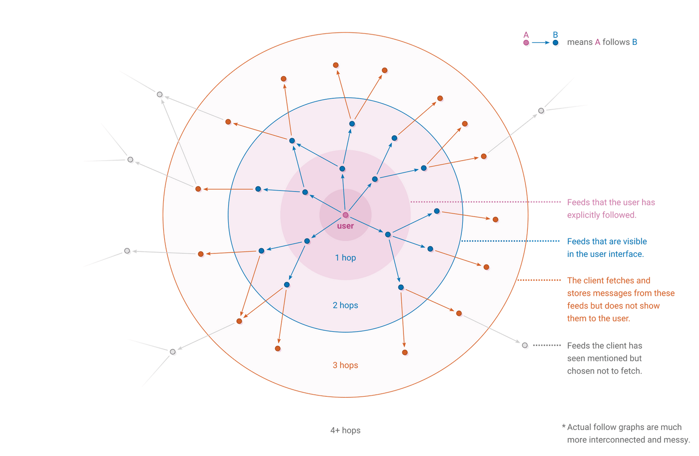SSB 中的“相遇”可以有很多不同的方式,包括本地网络、蓝牙直连,甚至是 U 盘、CD 等物理介质,不受互联网基建的限制。与所有其他基于友邻的分布式网络一样,新加入的用户很难开始探索,所以SSB中还设计一了种名为Pub的节点,既是一个互关的超级用户,也是一个公共空间。像真实世界的酒吧一样,人们可以在Pub中相互结识,在离开后相互关注。